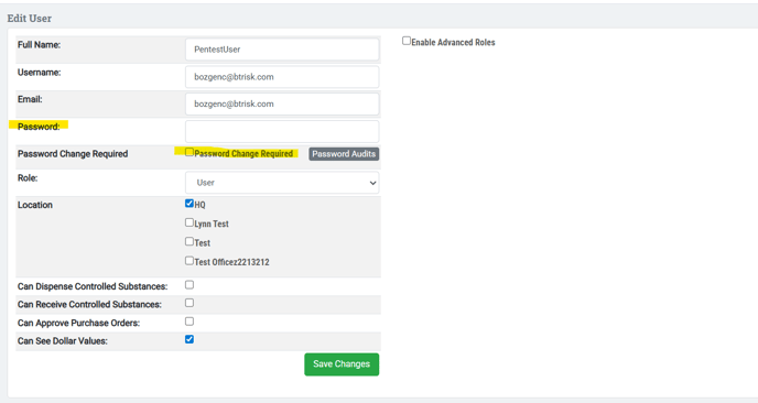 - Select the "Password Change Required" box if you'd like for the user to create their own password after they use the one you provide.
